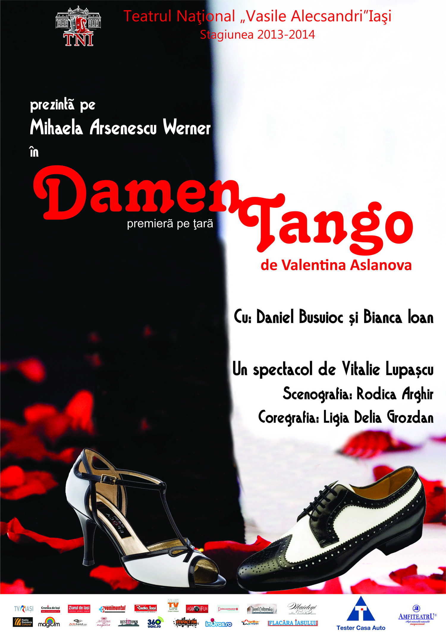 Damen Tango este a patra premiera a Teatrului National “Vasile Alecsandri” Iasi, din cadrul stagiunii 2013-2014. Un spectacol regizat de de Vitalie Lupascu, dupa un text scris de Valentina Aslanova, ce o are in prim plan pe actrita societar Mihaela Arsenescu Werner. Din distributie mai fac parte Daniel Busuioc si Bianca Ioan, scenografia fiind asigurata de Rodica Arghir, in timp ce miscarea scenica a fost realizata de Ligia Delia Grozdan. spectacolul se joaca din nou pe 9 ianuarie, 22 februarie, 13 martie, 30 mai, 8 iunie. In stagiunea 2014-2015, spectacolul poate fi vazut pe 9 octombrie, 8 noiembrie, 6 si 12 decembrie, 15 ianuarie, 13 si 28 februarie, 18 aprilie, 27 iunie. Update: in stagiunea 2015-2016, spectacolul se joaca pe 17 septembrie, 17 octombrie, 18 februarie, 10 si 29 martie, 14 aprilie, 7 si 21 mai, de la aceeasi ora. In stagiunea 2016-2017, spectacolul se joaca pe 30 martie, de la aceeasi ora.