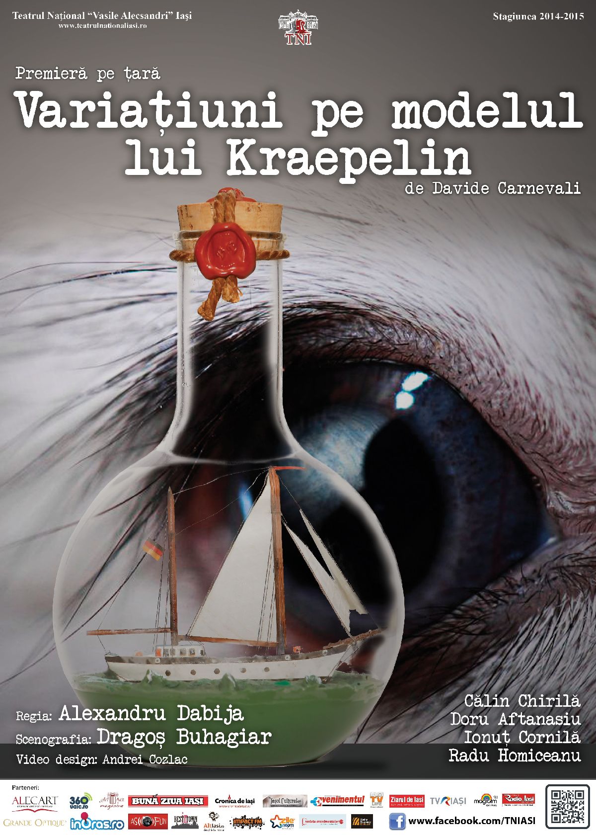 Dupa O noapte furtunoasa (2010) si Iasii in carnaval (2012), Alexandru Dabija revine la Teatrul National „Vasile Alecsandri” din Iasi si propune un text contemporan: Variatiuni pe modelul lui Kraepelin, de Davide Carnevali. Premiera nationala a avut loc pe 19 februarie, de la ora 19:00, pe scena Teatrului³, iar celelalte reprezentatii sunt programate pentru 26 si 28 februarie, 8 martie, 4 aprilie, 2 mai, 19 iunie. Update: in stagiunea 2015-2016, spectacolul se joaca pe 9 si 24 octombrie, 14 februarie, 8 mai, de la aceeasi ora.